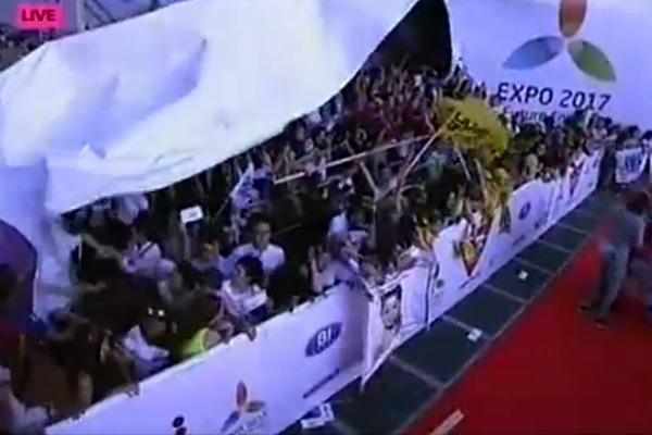 Онлайн трансляция прекратилась, когда на зрителей упала часть декораций. Гостей и зрителей спешно попросили пройти под крышу, где планируется проведение основной части мероприятия. Информация о пострадавших не сообщается.