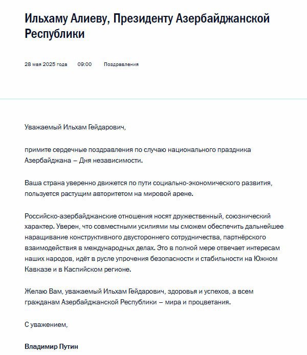 «Уважаемый Ильхам Гейдарович, Ваша страна пользуется растущим авторитетом на мировой арене», – говорится в поздравительном адресе президента РФ.