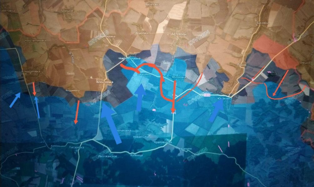 На южном фланге, в районе Юнаковки, идут ожесточённые встречные бои, российские подразделения атакуют позиции ВСУ в Варачино и продвинулись в направлении Храповщины. При этом Яблоновка уже под контролем ВС РФ — трасса Н-07 южнее перерезана, создавая угрозу окружения для украинских частей.