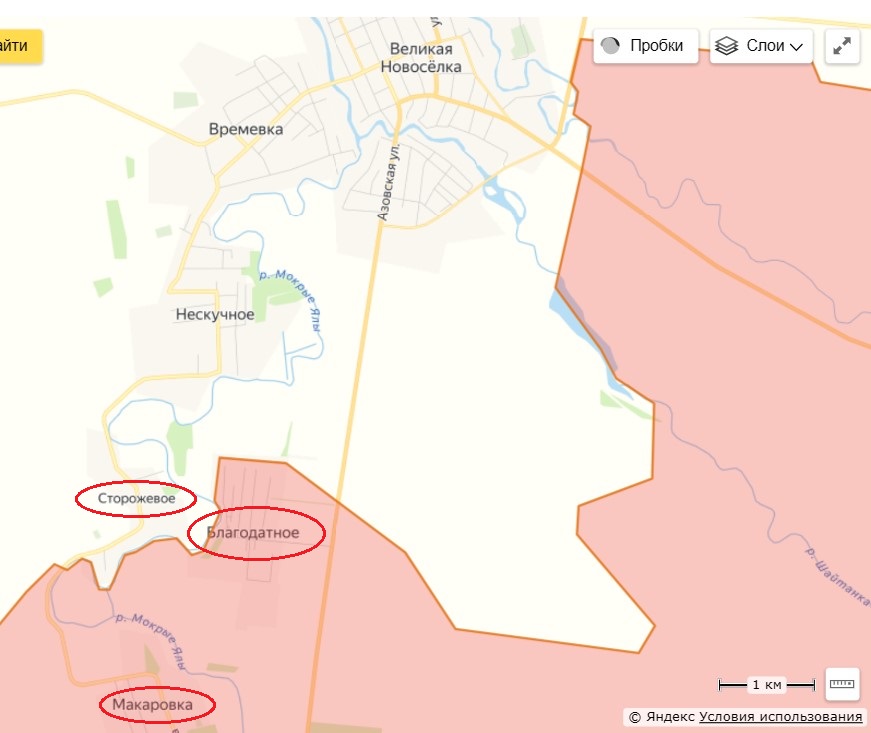 На данный момент, армия России продолжает срезать Времевский выступ, выжимая противника из поселков. По данным прозападного ресурса Deep State ситуация для ВСУ на Южно-Донецком направлении продолжает ухудшаться. Наиболее критическая обстановка наблюдается в районе Великой Новоселки, особенно на участке между Макаровкой, Благодатным и Сторожевым. Российские штурмовики предпринимают попытки прорваться в саму деревню Сторожевое с целью освободить и укрепиться в ней. Вероятно, действия ВС РФ направлены на окружение Великой Новоселки, что включает в себя перекрытие логистических маршрутов снабжения украинского гарнизона и, в конечном итоге, освобождение населенного пункта, что может привести к серьезным последствиям для Киева.
