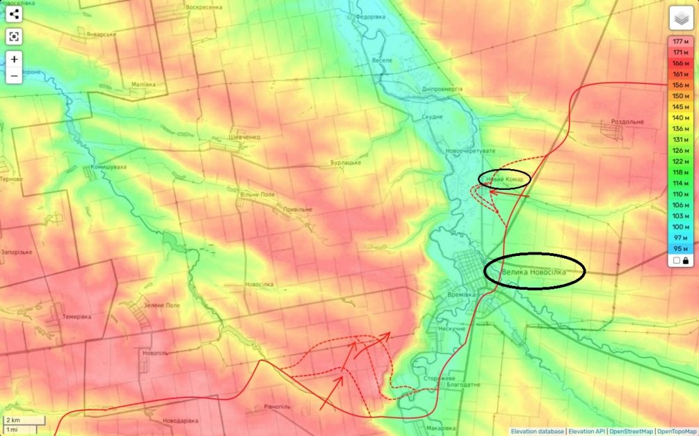 Сегодня утром наши войска, активно продвигаясь, сжимали в клещи гарнизон ВСУ, расположенный в Большой Новосёлке. Основные боевые действия развернулись в районе Нового Комара, откуда противник постепенно вытеснялся. Этот участок находится на северо-востоке, в то время как на юго-западе бои шли в районе Сторожевого и на холмах, расположенных западнее.