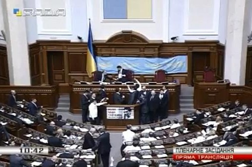 В Верховной Раде разворачивается очередное драматическое действо с возможным мордобоем. Свободовцы со своими сторонниками блокируют трибуну, требуя «линчевания» Яценюка.