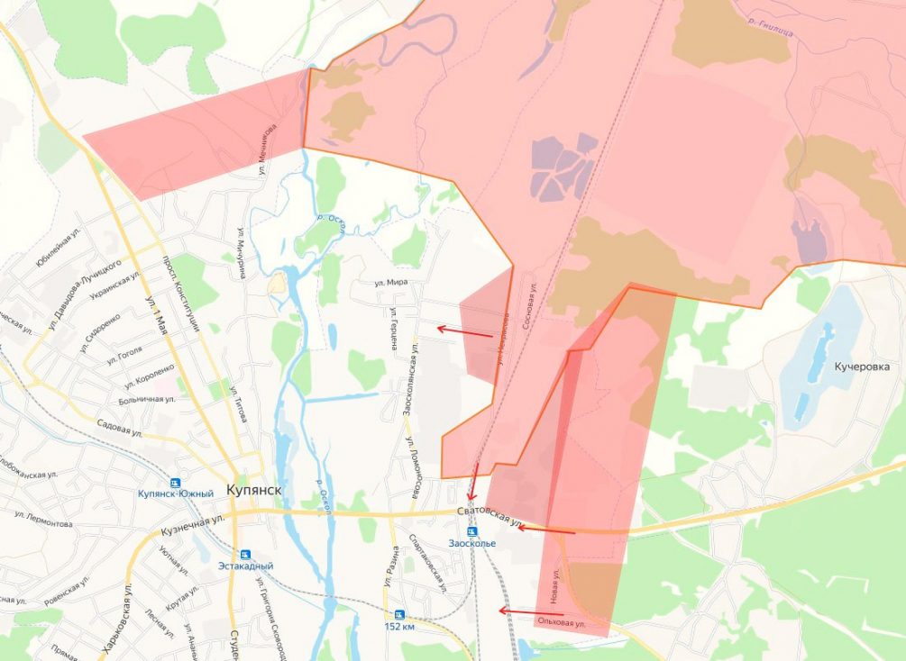 Контроль российских войск значительно расширился до промзоны Купянска. Кроме того, ВС РФ подошли вплотную к трассе на Сватово. Судя по карте, ВС РФ пытаются взять Купянск в клещи, окружить врага в городе и разгромить.