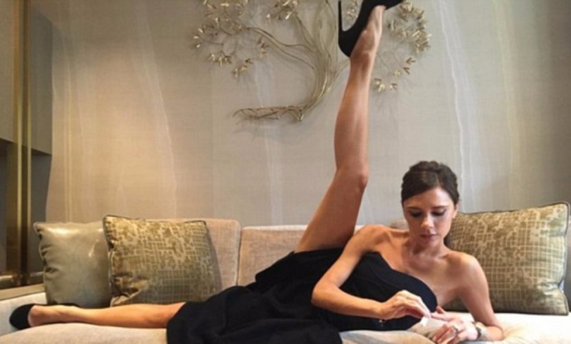 Жена не менее знаменитого в прошлом футболиста Дэвида Бекхэма позирует, лежа на диване, высоко подняв правую ногу и продемонстрировав завидную гибкость. В это время в руках у нее ватка с жидкостью для снятия лака.