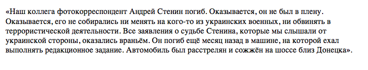 Страшные подробности обнародованы в заявлении гендиректора Дмитрия Киселева, подтвердившего гибель фотокорреспондента Андрея Стенина, пишет RT. В сообщении говорится, что журналист был убит около месяца назад, выполняя редакционное задание. Неизвестные расстреляли и сожгли машину представителей российских СМИ.