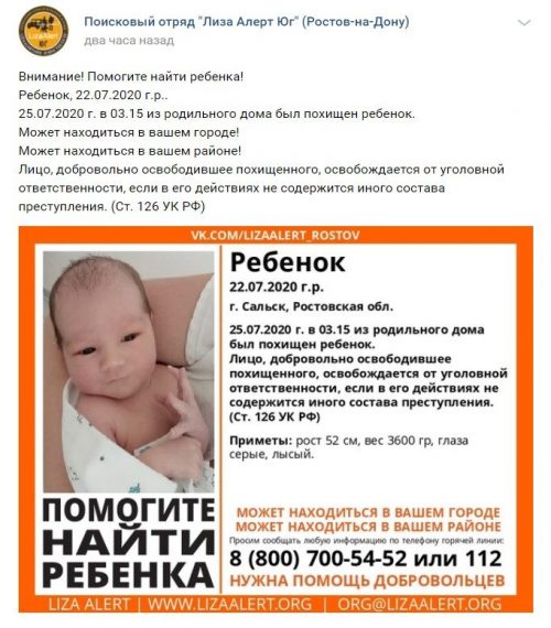 Об этом сообщает сайт "Блокнот Ростов". На странице сообщества "Поисковый отряд "Лиза Алерт Юг" (Ростов-на-Дону)" в ВК появилась информация о краже ребенка.