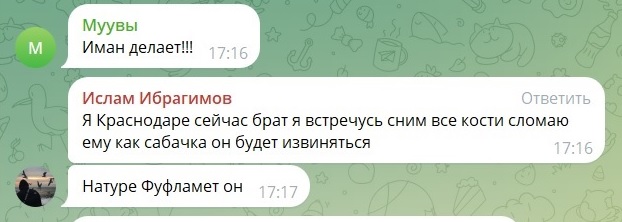 «Я сейчас встречусь с ним, кости все сломаю, будет как собачка извиняться», - пишет некий Ислам в ответ на резонные претензии со стороны одного из мужчин.