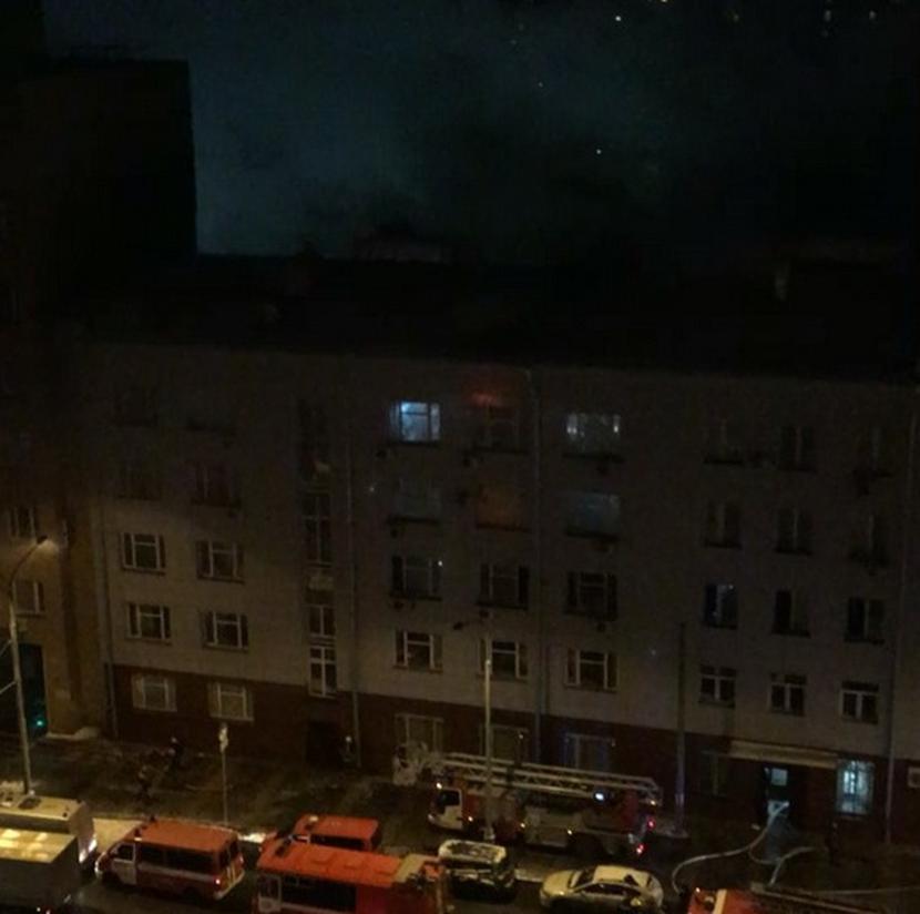 Снаружи не видно горения, лишь черный дым. Пожар происходит внутри пятиэтажного здания. Площадь возгорания продолжает расти и достигла 200 квадратных метров.