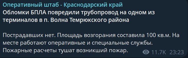 Позже региональный оперштаб уточнил, что в посёлке Волна Темрюкского района обломки беспилотника повредили трубопровод на одном из терминалов. Пожар удалось локализовать на площади около 100 квадратных метров. Пострадавших нет, на месте работали экстренные и специальные службы, продолжалось тушение и обследование территории.
