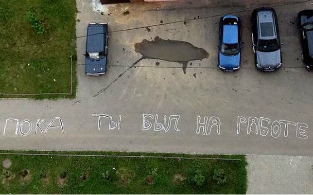 Подмосковный город Долгопрудный ошеломила дерзкая надпись на асфальте, написанная огромными буквами.