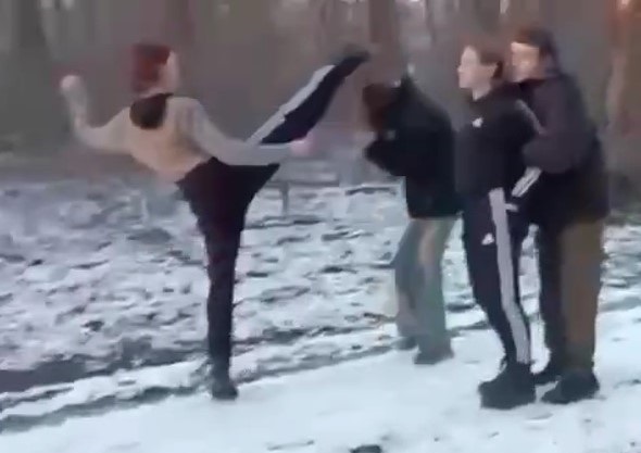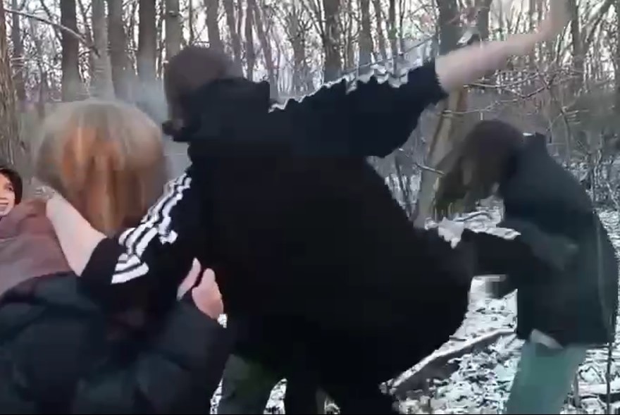 Далее несчастную начинают пинать ногами. Малолетние отморозки призывают друзей снимать происходящее. Девочка садится на снег, пытается укрыться от обидчиков, накинув капюшон и начинает реветь.