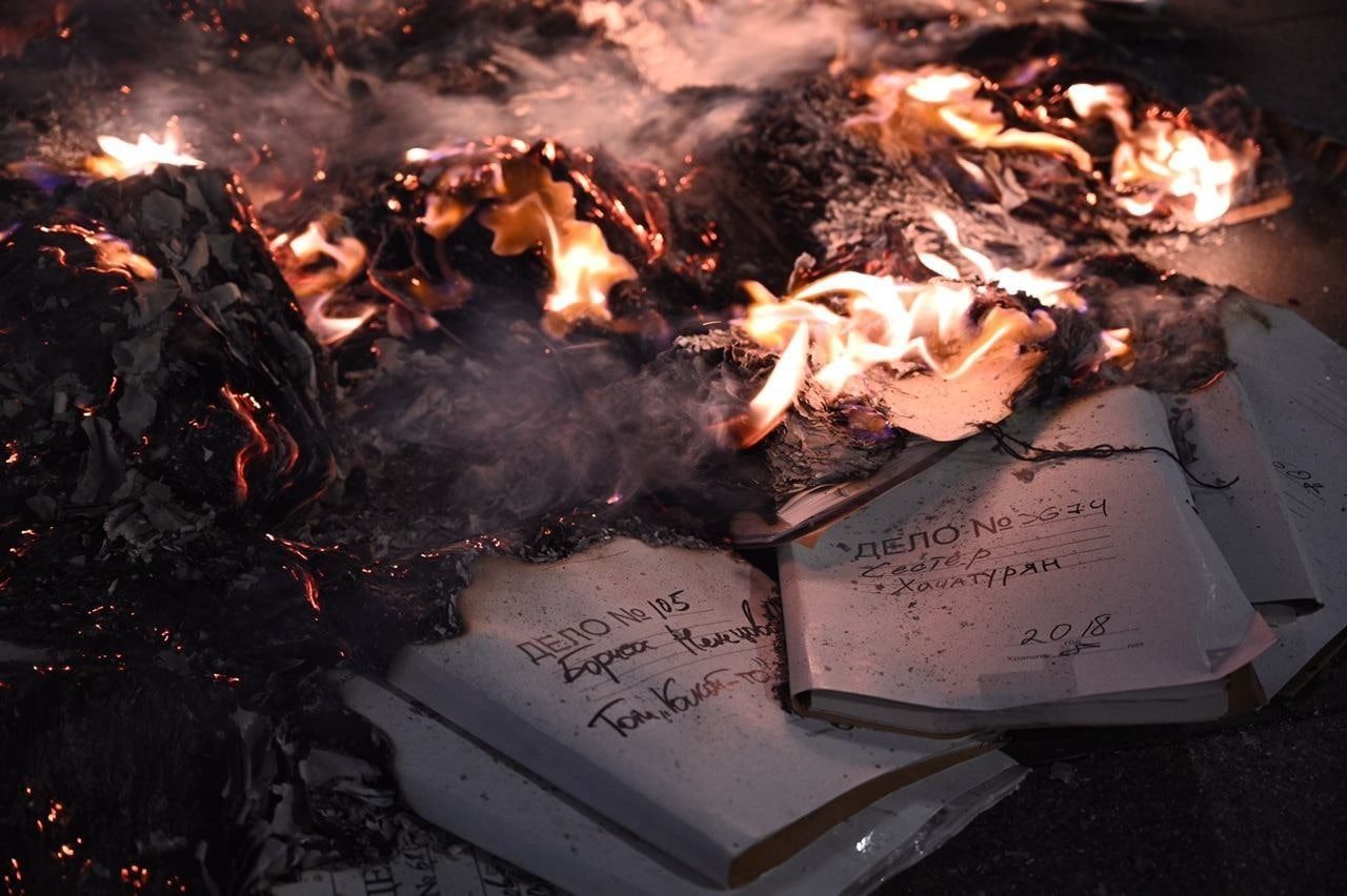 Возле ног акциониста его помощники развели костер из папок с названиями уголовных дел. Надпись на одной из папок гласила "Дело сестре Хачатурян". Ассистенты Крисевича были одеты в форму ФСБ.