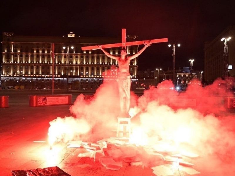 Вечером 5 ноября в центре Москвы, неподалеку от здания ФСБ на Лубянке, состоялся эффектный перфоманс. Известный акционист Павел Крисевич в набедренной повязке изобразил Иисуса Христа, распяв себя на кресте.