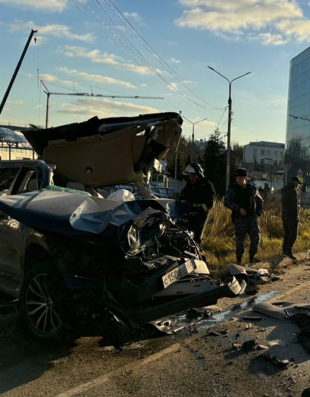 Удар оказался такой силы, что половина автомобиля оказалась искорежена, а двух находившихся в салоне людей выбросило наружу (предположительно, они не были пристегнуты ремнями).
