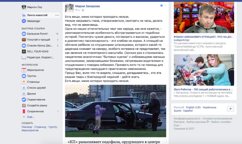 На своей странице в социальной сети Facebook Захарова прокомментировала заметку, появившуюся тремя сутками ранее в «Комсомольской правде». Там говорилось о том, что москвичка Екатерина - знакомая сотрудницы издания - увидела на Ленинградском проспекте страшную картину.