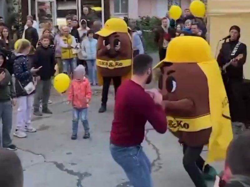 В ответ на это человек в костюме бочки начинает делать шуточные жесты, как будто приглашая гостя на борьбу. Но мужчина, не уловивший смысла юмора, нападает сначала на одного аниматора, нанося удары ногами, затем переключается на второго, избивая его кулаками в живот и пиная ногами.