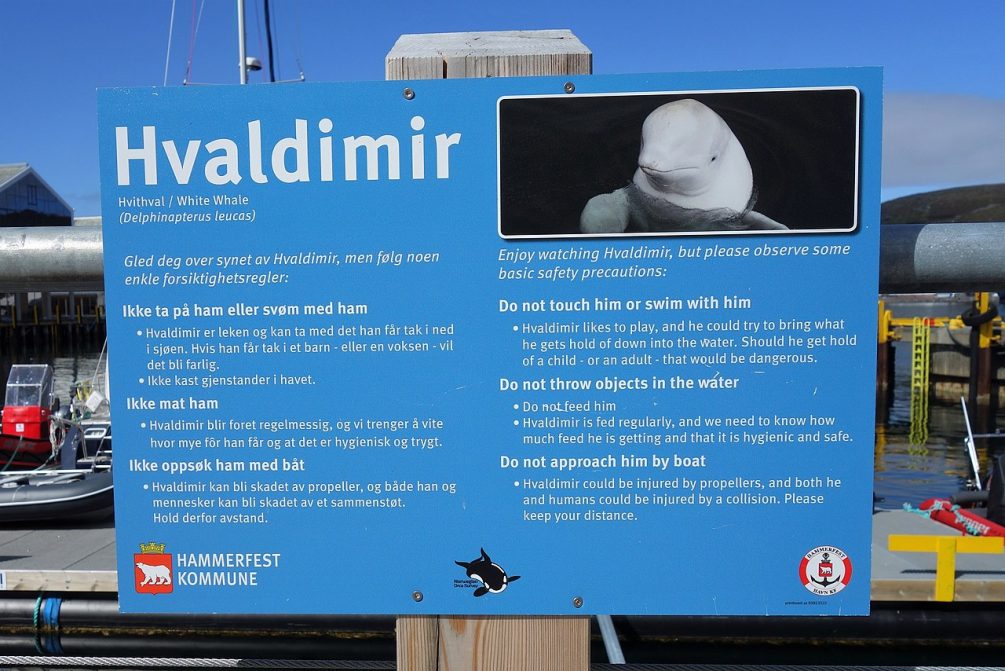 Кит очень популярен у рыбаков и туристов – любит играться, плескаться, совсем не боится людей. Но для него самого это небезопасно. Однажды он уже поранился о лодочный винт. Поэтому местные власти призвали сейчас граждан оставить Хвалдимира в покое и больше к нему не лезть.
