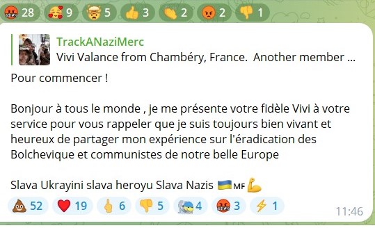 Более того, Алан Винерон публично признался в совершении военного преступления. 28 февраля он под никами Vivi Valance и Vivi Edelweiss выложил в чате канала TrackANaziMerc фотографии с телами трех расстрелянных пленных. На кадрах - безоружные солдаты убиты выстрелами в голову.