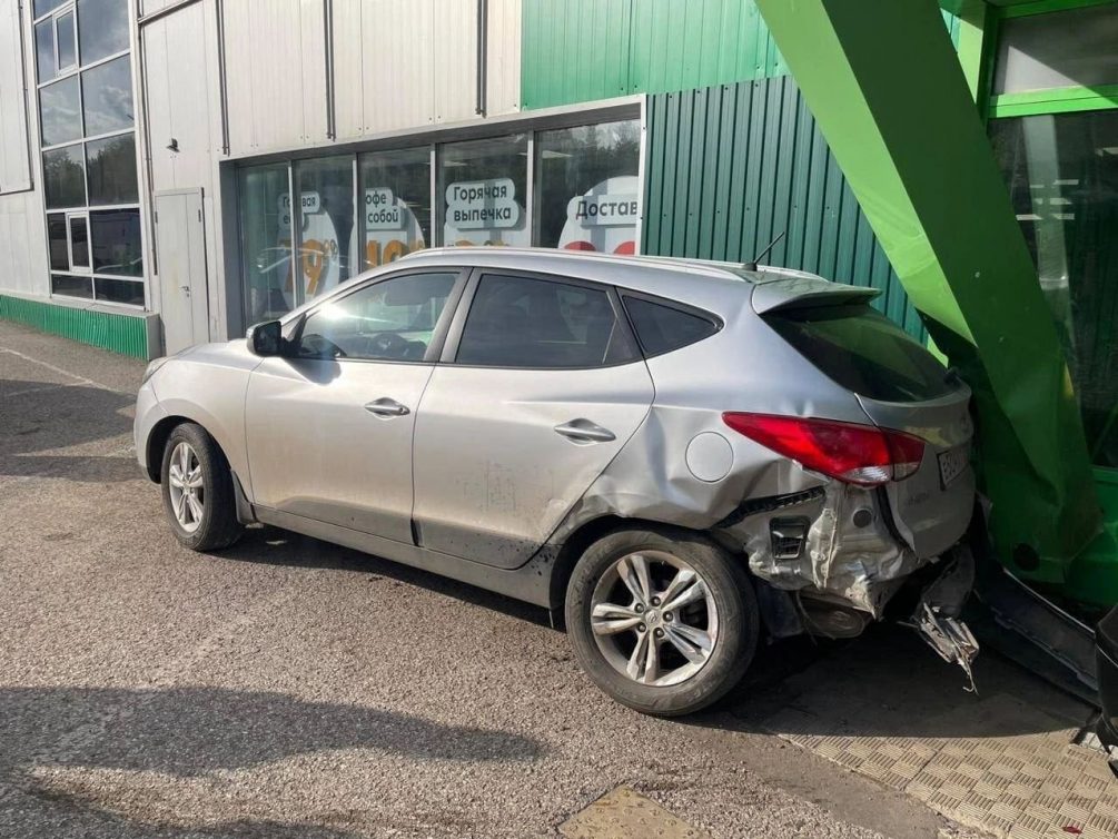 Уходя от столкновения с пешеходом на переходе иномарка на полном ходу врезалась в торговый центр, повредив входной комплекс супермаркета «Пятерочка».