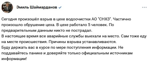 Противоречивые новости приходят также из Стерлитамака (Башкирия). Там что-то случилось на нефтехимическом заводе. Эмиль Шаймарданов, глава города, около 5 утра по МСК сообщил на своей странице в VK: «Произошёл взрыв в цехе водоочистки АО «СНХЗ». Частично произошло обрушение цеха. В цехе работало 5 человек. По предварительным данным никто не пострадал. В настоящее время все аварийные службы выехали на место. Сам тоже еду на месте происшествия. Причины взрыва устанавливаются».