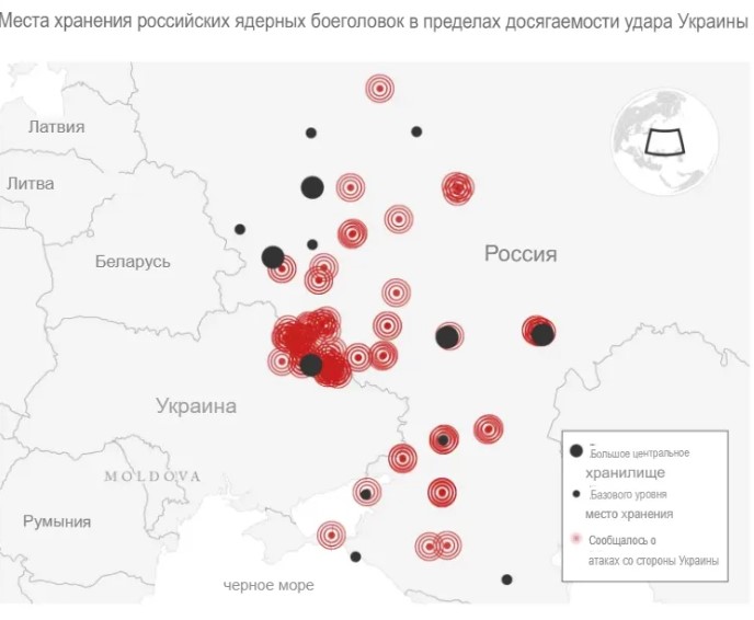 В частности, два объекта оборудованы менее чем в 160 километрах от границы, в пределах досягаемости украинских ракет. А ещё пять - менее чем в 320 километрах: т.е. в радиусе действия ракет, предоставленных Западом. В частности, по мнению американцев, один из основных складов расположен в Белгороде, где хранятся сотни ядерных боеголовок. Также аналитики сообщают о том, что значительное количество стратегического оружия РФ базируется под Курском и в Воронежской области. Также считается, что Россия хранит десятки ядерных бомб для самолётов на авиабазе «Ейск» в Крснодарском крае и в Морозовске Ростовской области.