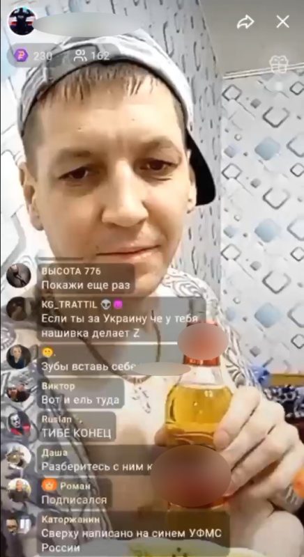 «Эти нашивки я оторвал у мёртвых солдат. Вы бежите, как крысы. На танках по людям разворачиваетесь. У меня ещё уши солдат лежат», - говорит пьяный мужчина во время трансляции, сопровождая свою лексику нецензурной бранью.
