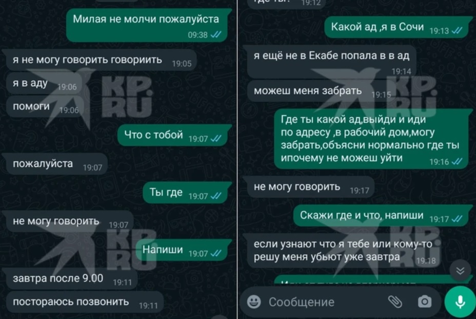 И вот, 13 октября Александр написал жене СМС: «Милая, не молчи, пожалуйста». И та ответила: «Я не могу говорить, я в аду. Помоги. Если узнают, что я тебе или кому-то пишу, убьют уже завтра. Пишу тайно. Завтра после 9:00 постараюсь тебе позвонить. Можешь забрать меня?». Далее пропавшая без вести вновь перестала выходить на связь.