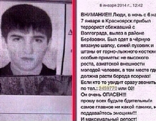 В городах края продолжают появляться листовки с фотографией и описанием разыскиваемого террориста. В них сообщается, что 7 января в Красноярск приехал подозреваемый мужчина, бежавший после серии терактов из Волгограда.