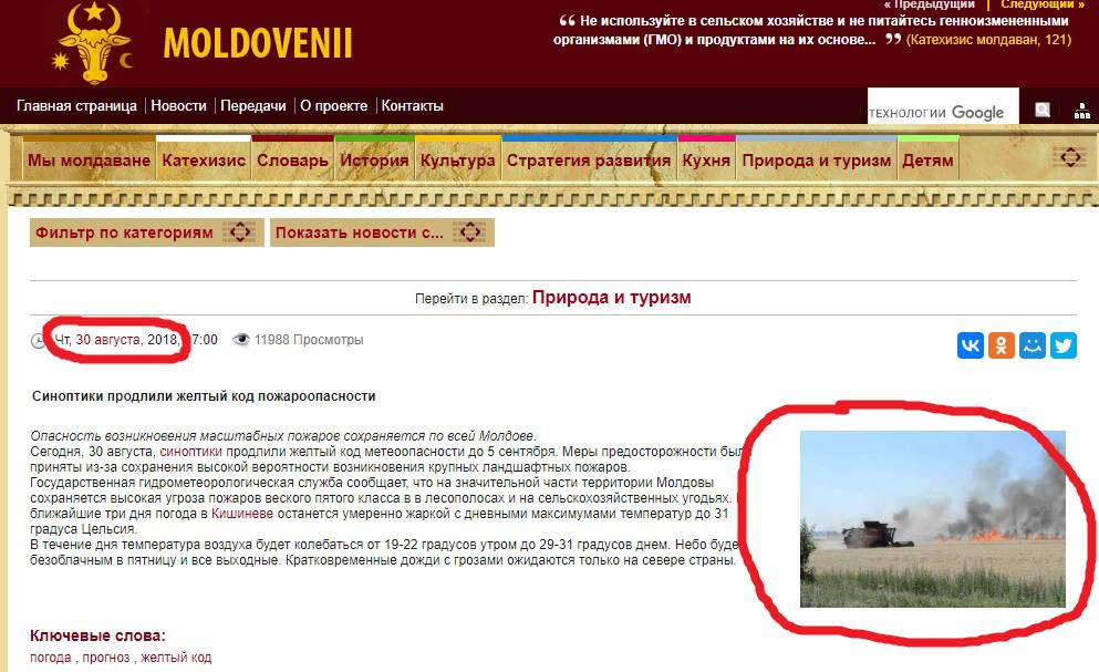 На самом деле, кадры с горящими полями были сделаны еще в 2018 году, выяснил телеканал «360». Тогда их активно использовали молдавские журналисты для того, чтобы иллюстрировать природные пожары, в том числе и на полях.