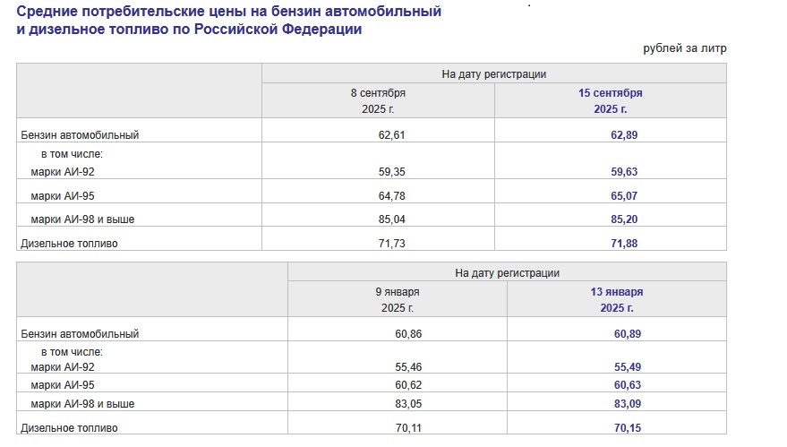 Впрочем, пока, по официальным данным Росстата, ситуация с топливом в пределах нормы (см. таблицу). Так, средняя стоимость бензина всех видов с начала года (9 января) к середине сентября (15 сентября) выросла с 60,86 до 62,89 рублей за литр. То есть всего на 3,3%. Дизтопливо и вовсе было 70,11 рублей, стало 71,88 – подорожало всего на 2,5%. Разве что 92-й и 95-й бензины показали чуть более высокую динамику.