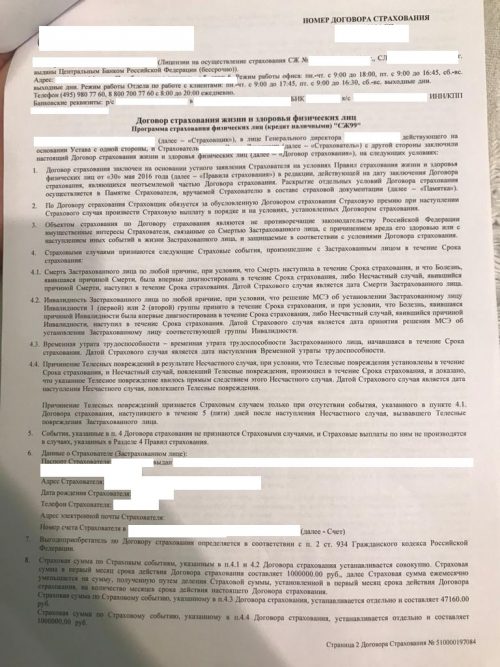— В договоре страхования только заголовок «Договор страхования жизни и здоровья физических лиц, программа страхования физических лиц (кредит наличными)». По сути договор страхования не привязан к кредитному договору банка. Указано только, что возврат средств возможен при расторжении в течение 14 дней с момента подписания договора, а дальше уже деньги никто не вернет и не пересчитает. Но это обход закона псевдозаконными формулировками, — считает Сати.