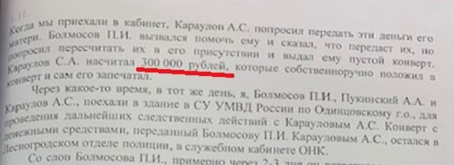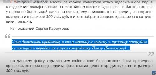 Вот показания Караулова: «Сняв денежные средства, я сел в машину к лысому и тучному сотруднику полиции и передал их в руки сотруднику Павлу (Болмосову)…»