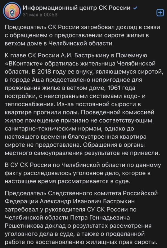 В мае 2023 года ситуацию обещали взять под контроль в Следственном комитете России. Председатель СК РФ Александр Бастрыкин потребовал у руководителя СК по Челябинской области доклад о результатах уголовного дела в суде, а также " о проделанной работе по восстановлению жилищных прав сироты». Но пока игнорируют даже личный интерес Бастрыкина, и Никита продолжает существовать в квартире, условия в которой не подходят ни для создания семьи, ни в целом для достойной жизни.