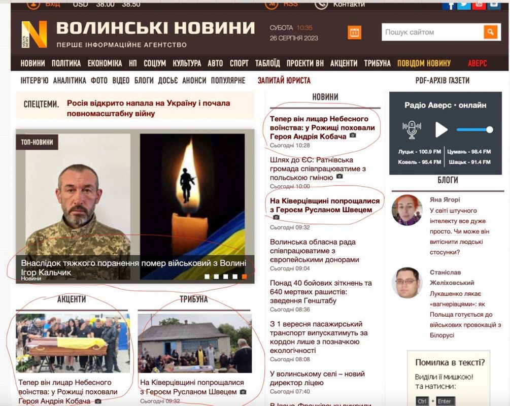 Кроме того, если открыть любой сайт волынских новостей, то большая часть материалов это некрологи. К примеру, только на главной странице сайта Volynnews мы насчитали 11 материалов, посвященных гибели украинских боевиков. И это только то, что попадает в СМИ.