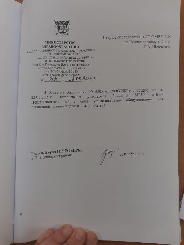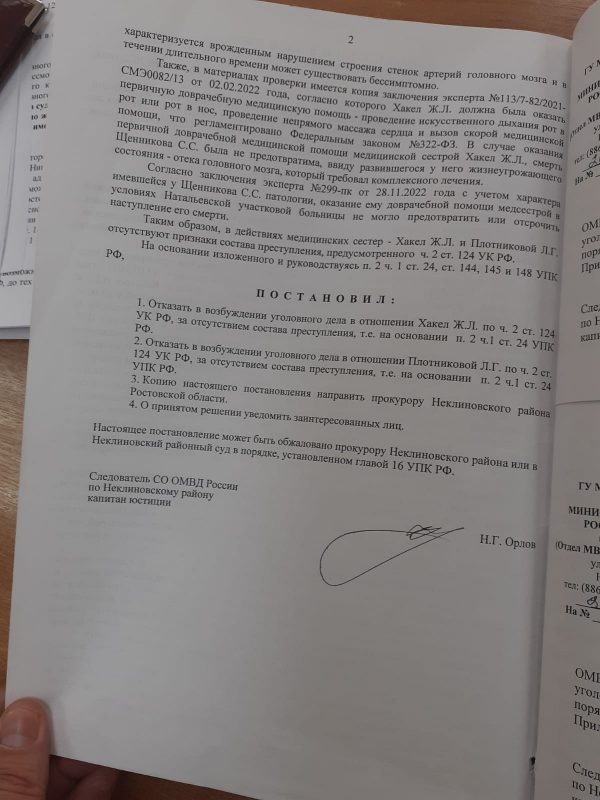 Уголовное дело было возбуждено по факту причинения смерти по неосторожности по ст. 109 УК РФ. Но в ноябре 2022 года Следственный комитет по РО прекратил его и передал материалы дела в отдел полиции по Неклиновскому району РО по другой статье - ст. 124 УК РФ по факту неоказания помощи больному без уважительных причин.