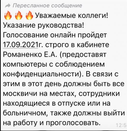 Отметим, первоначально работникам будто бы прислали в чат сообщение о том, что проголосовать все должны в первый же день, доступный для голосования, 17 сентября — причем, онлайн и в кабинете заместителя директора Романенко Евгении Александровны. Сама замдиректора все отрицала и отметила, что люди, наверное, неправильно ее поняли.