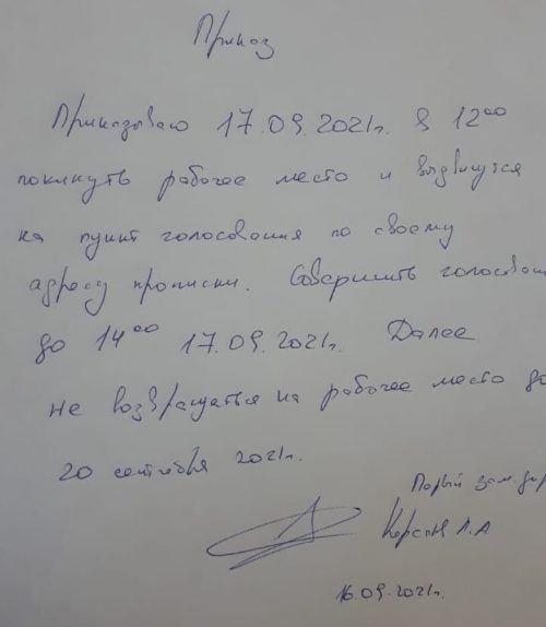 Не прошло и суток как некоторые из работников получили любопытные бумаги. В написанном от руки документе, именуемом приказ, сказано, что работник должен покинуть свое место и «выдвинуться на пункт голосования по своему адресу прописки», проголосовать до 14:00, а затем «не возвращаться на рабочее место до 20 сентября».