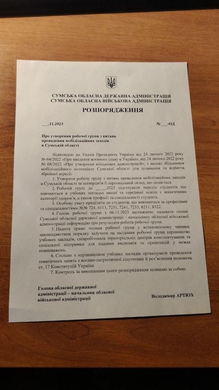 В нем, в частности, говорится о создании рабочей группы по вопросам мобилизационных мероприятий в Сумской области. Чиновникам поручено подготовить список студентов, которые получают высшее и среднее образование, с указанием категории здоровья и специальности студентов, а также организовать совместную работу учебных заведений и ТЦК. На заседания призывных комиссий будут привлекать руководство учебных заведений.