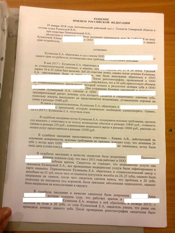 Все началось в 2017 году, когда жительница города Тольятти в Самарской области Елена Кузнецова обратилась в местную частную стоматологию с жалобами на кариес. После лечения боли не проходили, и Елена решила обратиться в другую клинику. Оказалось, в зубе остался обломок стоматологического инструмента. Извлечь его было уже нельзя, пришлось удалять зуб и ставить коронку. Тогда-то Елена и обратилась в суд с требованием взыскать с первой стоматологии возмещение лечения и компенсацию морального вреда. Но Автозаводской районный суд Тольятти отказался удовлетворять ее требования.