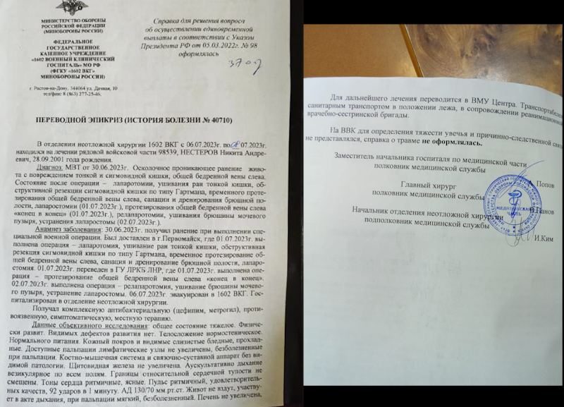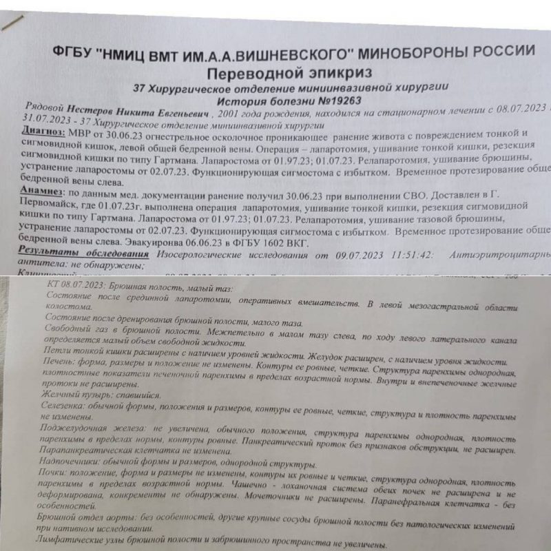«Уважаемый Сергей Кужугетович! Это моя мольба о помощи к вам! Мой сын Нестеров Никита Евгеньевич 28.09.2001 года рождения будучи срочником сам изъявил желание подписать контракт и пойти на СВО защищать нас и нашу страну. Был причислен к 200-й бригаде, которая находилась на самой передовой линии. 30 июня 2023 года получил тяжелейшее ранение. Ему разорвало бедренную вену в левом паху, посекло металлическими осколками весь кишечник и мочевой пузырь снизу до верху ударной волной от Польской противотанковой мины. 1 июля был оперирован в Бахмуте, далее 2 операции в ЛНР 2 июля. Далее он был переведён в госпиталь Ростова, далее в госпиталь Вишневского, и на сегодняшний день находится в гражданской больнице ветеранов войн № 2 в Москве. С момента ранения прошло уже 2 месяца. У сына выведена калостома. Кишка, выведенная наружу, приросла к коже на животе, появился зуд и сыпь вокруг нее. Также беспокоят спазмы и колики. В данной больнице лечения никакого не оказывается. Боец несколько раз подходил с жалобами к хирургу, к лечащему врачу. Реакция – «иди в палату». Сам себе покупает спазмалитики», - поделилась Елена.