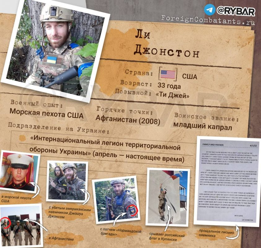 «На плече у Джонстона регулярно красуется патч «Нормандской бригады», что может свидетельствовать о переходе подразделения в подчинение «Интернационального легиона». Джонстон был близким другом другого американского наемника Джошуа Алана Джонса, ликвидированного 22 августа под Угледаром», — отмечает Рыбарь.
