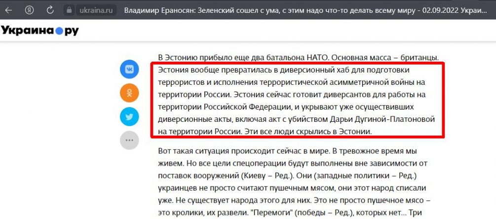«Эстония вообще превратилась в диверсионный хаб для подготовки террористов и исполнения террористической асимметричной войны на территории России, - рассказал в интервью изданию «Украина.ру» эксперт Бюро военно-политического анализа, кандидат политических наук, капитан Первого ранга запаса, Владимир Ераносян. - Эстония сейчас готовит диверсантов для работы на территории Российской Федерации, и укрывают уже осуществивших диверсионные акты, включая акт с убийством Дарьи Дугиной-Платоновой на территории России. Эти все люди скрылись в Эстонии».