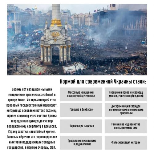 На протяжении этих 8 лет, с 2014 года, из-за некомпетентной и откровенно наплевательской, халатной политики киевских властей Луганск, Донецк и прилегающие к ним территории, фактически были доведены до состояния глубокого гуманитарного кризиса. Все это происходило путем торговой блокады, целенаправленным разрушением гражданской инфраструктуры, не говоря уже об уничтожении большого числа мирных людей.