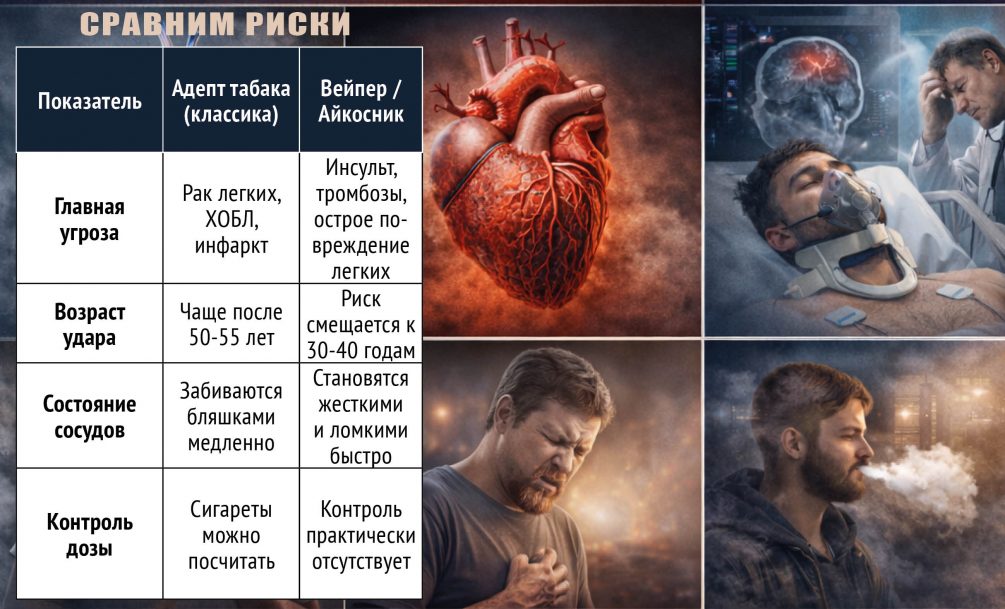 Времена, когда от человека пахло «курятиной», безвозвратно ушли. Маркетинг сработал гениально: если нет горения и смолы – нет и проблем. А пар, это же почти как ингаляция! Но вот незадача: в отделения неврологии всё чаще привозят 30-летних ребят с инсультами. Глядя на их сосуды, врачи хватаются за голову. Так кто же рискует своим здоровьем больше?