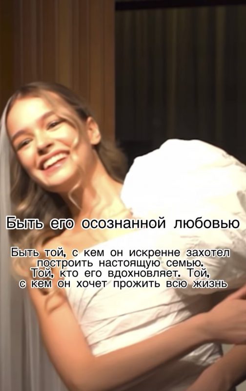 «Быть его первой влюбленностью? Быть его школьной влюбленностью? Быть той, которая понравилась ему на работе? Нет. Быть его осознанной любовью. Быть той, с кем он искренне захотел построить настоящую семью. Той, кто вдохновляет. Той, с кем он хочет прожить всю жизнь», - заявила молодая супруга режиссера.