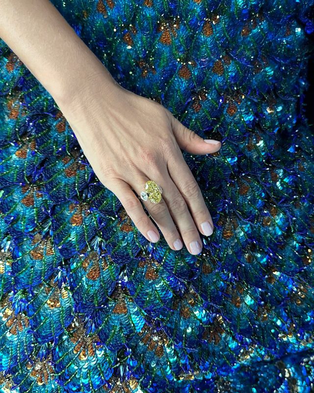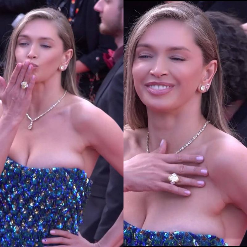 Неожиданно в Каннах появилась и 43-летняя украинская исполнительница Вера Брежнева, экс-солистка «ВИА Гры». Возможно, её выход на дорожку никто бы и не заметил, но она сама похвасталась в соцсетях и выложила несколько фото. Вера позировала журналистам в длинном синем платье со шлейфом, имитирующем хвост павлина. Платье декорировано множеством кристаллов Swarovski, оно переливалось на солнце, а его вес составляет 14 кг. Стилисты дополнили образ колье и кольцом с жёлтым бриллиантом от Chopard на безымянном пальце. Помолвочное оно или нет, неизвестно.