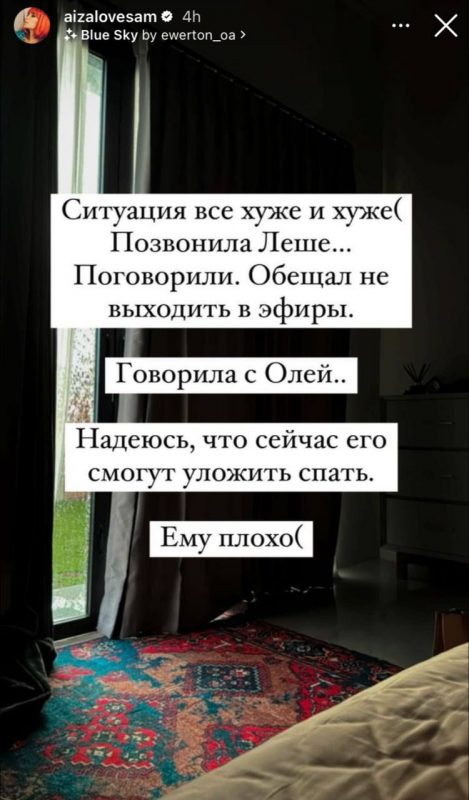 «Ситуация патовая. Мне сильно жаль Сэма (сын Гуфа от Айзы - прим.ред), который все это наблюдает вместе с вами, жаль Тину (дочь Гуфа от Юлии - прим.ред), которая будет это наблюдать. Жаль Олю (сестра Гуфа - прим.ред). Жаль Юлю. И очень сильно жаль Лешу. Я совершенно не знаю, что может произойти с ним в любую секунду. Мое предчувствие меня пугает», — добавила Айза.