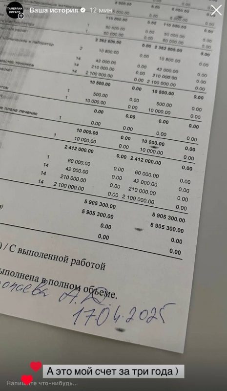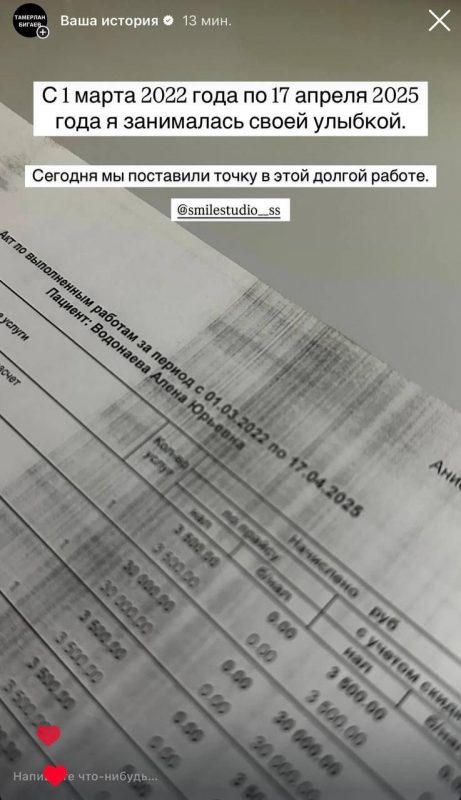 «С 1 марта 2022 года по 17 апреля 2025 года я занималась своей улыбкой. Сегодня мы поставили точку в этой долгой работе. Это мой счет за три года. Почти шесть миллионов рублей. Я больше не целуюсь по любви», — заявила Алёна.