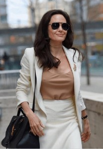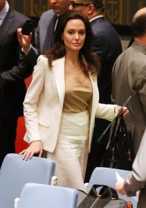 Посланница доброй воли Управления Верховного комиссара по делам беженцев ООН приняла участие в обсуждении кризиса в Сирии. Для столь важного мероприятия, состоявшегося в Нью-Йорке, супруга Брэда Питта выбрала строгий белый костюм и блузку, под которой не оказалось бюстгальтера. Папарацци тут же воспользовались моментом и сфотографировали секс-символ Голливуда.