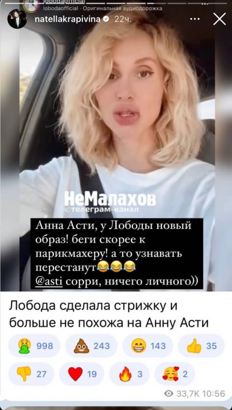 «Анна Асти, у Лободы новый образ! Беги скорее к парикмахеру, а то узнавать перестанут. Сорри, ничего личного», - язвительно написала Крапивина в своих социальных сетях.
